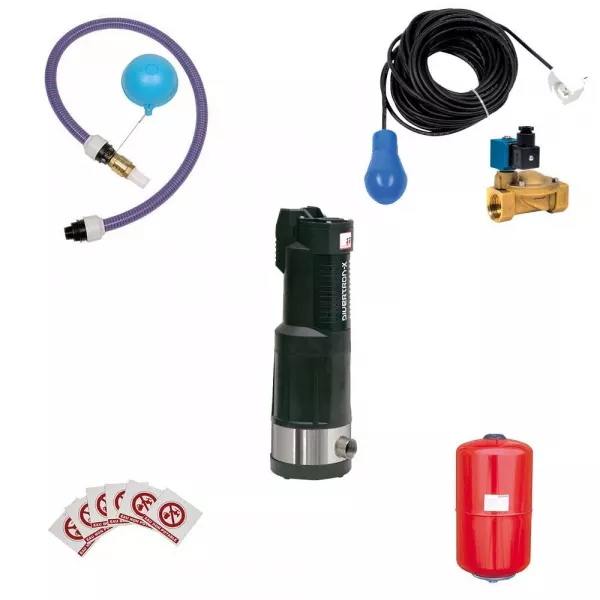 Pompe immergée automatique, kit d'aspiration avec crépine flottante et réservoir de 8L.